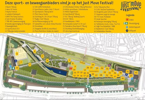 Tijdens het Just Move Festival kun je de hele dag lang, tussen 11.00 en 17.00 uur, kennismaken met meer dan 35 sport- en beweegaanbieders. Bedwing de stormbaan, doe mee aan een judoclinic, kom badmintonnen of (tafel)tennissen, bewonder dansdemonstraties, doe mee aan een ASM-workshop voor ouderen, waag een poging om de snelste Tilburger te worden of daag je vrienden en familie uit voor een spelletje beachvolleybal!